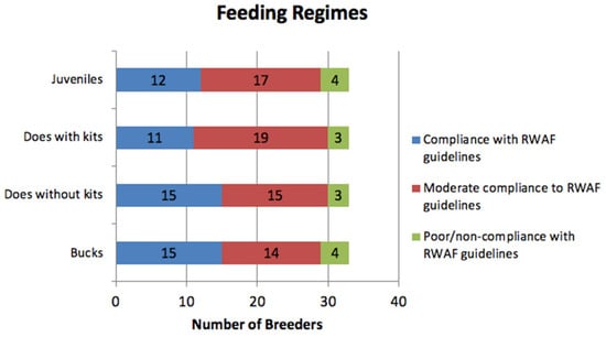 All breeders indicated that they gave access to fresh grass for all their rabbits, however when asked to detail their feeding regime, only four breeders included fresh grass. In compliance with the RWAF guidelines (85% hay, 10% greens and 5% pellets []); appropriate amounts of hay (body sized), a small number of pellets/pellets once daily and greens three or more times a week was given to 45.5% of bucks, 45.5% of does without kits, 33.3% of does with kits and 36.3% of juveniles (Figure 3). Those who gave mostly hay with or without pelleted food and/or greens were considered to be in moderate compliance with RWAF guidelines and accounted for 42.4% of bucks, 45.5% of does without kits, 57.6% of does with kits and 51.5% of juveniles, and those who gave a poor diet; not including hay, and/or feeding of muesli and/or bread accounted for 12.1% of bucks and juveniles and 9.1% of does (Figure 3).