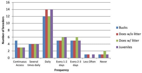 Adult bucks and does have a recommended floor area of 7500 cm2 in farmed rabbits [], 10 breeders did not meet this minimum requirement for their adult rabbits. When considering the minimum requirements for housing pet rabbits (11,148 cm2), 17 breeders did not meet these for some or all of their rabbits. Four breeders did not indicate housing height for all rabbits, and 21 breeders (63.6%) provided housing height less than the 75 cm recommended by the Scottish Government for pet rabbits []. One breeder provided housing that was below the minimum recommended height of 45 cm for laboratory and farmed rabbit housing [,]. All housing was cleaned at least weekly by breeders.