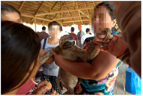 On separate days two researchers attended the tours as tourists. The tours took place between 10:00 a.m.–17:00 p.m. Each tour followed a similar pattern, during the first part of the tour tourists congregated on a platform typically for one hour. In addition to handling brown-throated three-toed sloths, tourists were offered the opportunity to hold other species including common caiman, green anaconda and to touch free-ranging baited squirrel monkeys, various parrot species and toucans. As soon as this part of the tour began, the researchers started filming (using GoPro HERO4 Session and Sony HDR-CX625 cameras, GoPro, Inc., San Mateo, CA, USA). The researchers stood 0.5–2 meters from sloths being handled by the tourists or tour guides and filmed continuously for the entire handling period (including when the sloth was passed between people), this was considered one focal observation (handling refers to when tourists or tour guides were physically holding one or more sloth(s).) When tourists held the sloths, they were often not supervised (Figure 1).