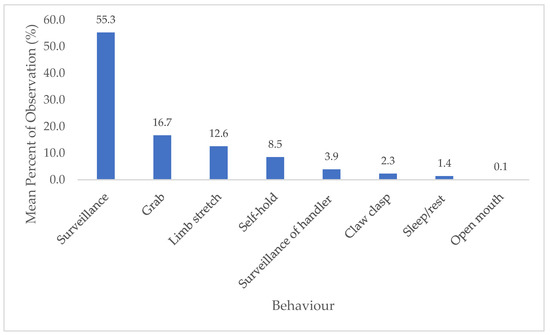 During handling, the sloths were seen to engage in eight different types of behaviour. A significant difference was found between the duration of the behaviours performed (Χ2 = 68.078, df = 6, p = < 0.01). During the focal observations (for all sloths combined) we found that the two behaviours performed for the longest mean duration were surveillance (55.3%) and limb stretching (12.6%) (Figure 2).