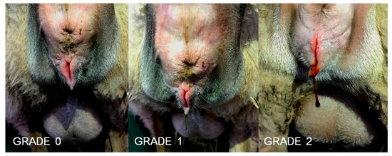 The intravaginal device was withdrawn on the same day in all the animals and therefore, animals in short treatments had 7 days of treatment with the device, animals in long treatments had 14 days, while control animals had zero days. At intravaginal device withdrawal, characteristics of vaginal discharge (i.e., amount, odor, whether purulent or hemorrhagic) were scored (0—negligible or no discharge; 1—some amount but clear discharge; 2—abundant amounts and hemorrhagic or purulent; Figure 1). Immediately, a sterile swab (Cary Blair sterile transport swabs, Deltalab, Barcelona, Spain) was used to collect mucus samples from the posterior region of the vagina (4 to 5 cm into the vagina), which were sent to the laboratory for bacterial culture. Finally, vaginal mucus pH was evaluated using pH-indicator strips (Merck KGaA, 64,271 Damstadt, Germany; working range pH 6.5–10.0).