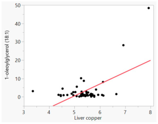 In this study there were only two dogs with liver copper levels above 1000 ppm, and they belonged to breeds which are more prone to suffer from oxidative damage. These animals were the main drivers of all the Pearson correlations. An example is illustrated in Figure 1, which shows the highest correlation in the study between copper and a molecule from the lipid metabolism pathway (1-oleoyl-glycerol). Although the observation with highest concentration (2768 ppm or 7.93 ln copper; Figure 1) was a statistical outlier, we decided to keep it in the data due to its important biological significance. Hepatic copper concentration had a positive correlation to a few metabolites from the lipid metabolism pathways. Copper correlated (p ≤ 0.001) with monoacylglycerols 1-oleoylglycerol (18:1), 1-linoleoylglycerol (18:2), 2-linoleoylglycerol (2-monolinolein) and 1-arachidonylglycerol (R = 0.58, 0.56, 0.50 and 0.42, respectively; Table 2). Monohydroxy fatty acid 13-HODE + 9-HODE and stearoyl-arachidonoyl-glycerophosphocholine (2) also correlated to copper (p ≤ 0.001), but to a lesser extent (R = 0.44 and 0.43, respectively).