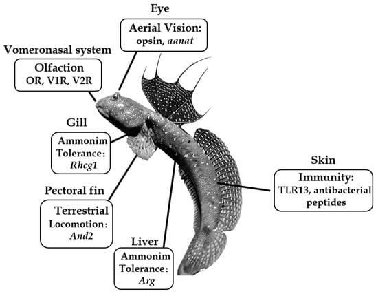Mudskippers spend part of their lives out of water to feed, mate, and avoid capture by terrestrial predators. Therefore, they have developed behavioral and physiological specializations for adaptation to the amphibious life. The most significant morphological and functional modifications (Figure 1) are the trend to possess close-set and moveable protuberant eyes set high on the head for escape from predators on land, and the eyes are structural adapted for accurate vision in both air and water []; higher ammonia tolerance allow the fish to live in the high concentration of NH3/NH4+ within the intertidal zone [,,]; stronger pectoral fins help mudskippers crawl and jump in the mudflat []; higher disease resistance enables mudskippers to inhabit both aqueous and terrestrial environments []; and specialized skin retains more water for them to stay on land for a longer period [].