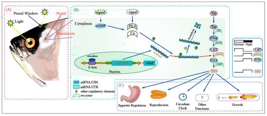 Outline of melatonin biosynthesis in the fish pineal gland []. (A) Photoreceptive and transmission system; (B) Melatonin synthesis pathway; (C) Biological functions of melatonin. Aralkylamine N-acetyltransferase (AANAT, shown highlighted in the center of the figure), is the key to melatonin biosynthesis in vertebrates, being upregulated and downregulated on a circadian rhythm with other neuromodulators. AANAT exists in tetrapods as a single gene, whereas there are three genes in teleosts (AANAT1a, AANAT1b, and AANAT2). BP contains all the three AANATs, whereas PM has lost AANAT1a []. Abbreviations: AAAD, aromatic-l-amino-acid decarboxylase; ASMT, acetylserotonin-O-methyltransferase; Ca, calcium; cAMP, cyclic adenosine monophosphate; PKA, protein kinase A; HTrp, 5-hydroxytryptophan; 5-HT, 5-hydroxytryptamine; NAS, N-acetylserotonin; MEL, melatonin; Trp, tryptophan; TPH, tryptophan hydroxylase.