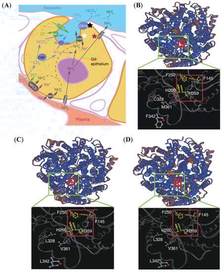 PM lives mostly out of water, and its excretion of NH3 could be volatilized without moisture removal and acid damage to fish skin. Under the high ammonia stress, the transcription levels of Na+/K+(NH4+)-ATPase (Nka), Na+/K+(NH4+)/2Cl− cotransporter 1 (Nkcc1), CA15, and NH3 transporting channel related Rhesus glycoprotein type c (Rhcg1) are up-regulated []. We also observed that there are more hydrophobic amino acid residues in the functional center of Rhcg1 (Figure 4B–D) in PM that could excrete the NH3 more effectively than BP. Interestingly, our genomic data proposed a positive selection of the CA15 gene in both BP and PM, whereas NHE and Rhcg1 genes are positively selected specifically in BP and PM, respectively.