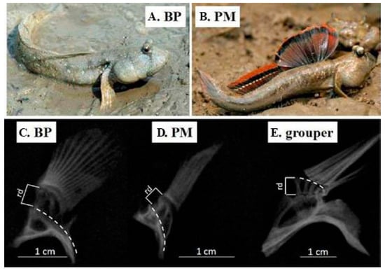 BP is predominantly aqueous and spends less time out of water, whereas PM is primarily terrestrial with more time on land. From the anatomical analysis on pectoral fins of BP, PM, and Epinephelus coioides (orange-spotted grouper; Figure 5E), we observed more protrusion of the radials in the pectoral fins of both BP and PM (Figure 5C,D), indicating the terrestrial properties of mudskippers []. Wang et al. [] used an efficient high speed photography system to check the kinematics of live mudskippers and demonstrated that mudskippers used both body and pectoral fins simultaneously for locomotion in water, while they only used pectoral fins to move on land.