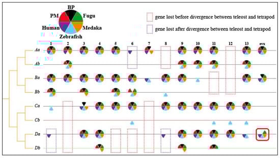 Hox gene clusters in fish and human []. The red solid box highlighted the loss of hoxDa-evx of BP and PM, which may generate neurological and morphological effects during development. Numbers 1–13 and evx are the general codes for hox genes.