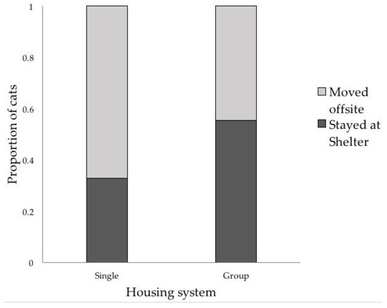 Single-housed cats were 2.5 times more likely to be moved offsite than group-housed cats (χ2 = 11.52, df = 1, p < 0.001, OR: 2.56, CI: 1.48–4.43).