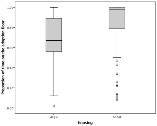Single-housed cats spent significantly less time visible on the adoption floor than group-housed cats (W = 14,844.00, Z = 5.78, p < 0.001).