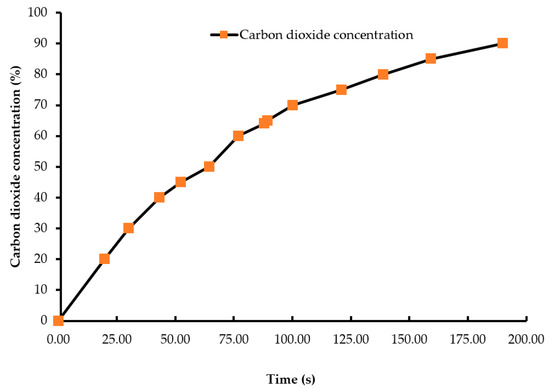 Carbon dioxide wash-in curve (concentration vs. time). The carbon dioxide concentration in the beginning of the treatment was 0.04% which increased to 90% as the chamber was being filled by carbon dioxide gas. An infrared CO2 sensor measured the gas concentration inside the chamber during the experiment.