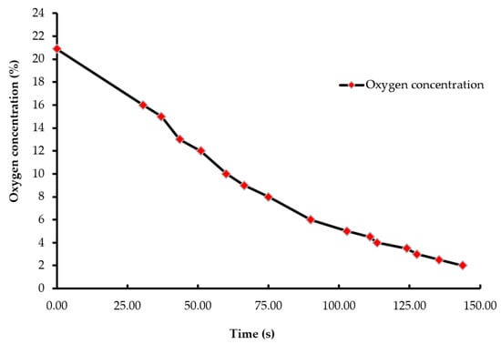 Oxygen wash-out curve (concentration vs. time). The oxygen concentration at the beginning of the treatment was 20.9%, which decreased to less than 2% as the chamber was being filled by nitrogen gas. An electrochemical oxygen sensor measured the oxygen concentration inside the chamber.