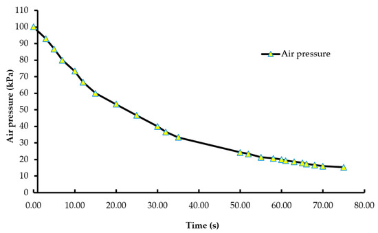 Pressure wash-out curve (pressure vs. time). The air pressure of the chamber was decreased from 100.12 kPa to 15.3 kPa during the LAPS treatment. The custom-built vacuum system was equipped with a vacuum controller, which measured and maintained negative air pressure within the chamber.