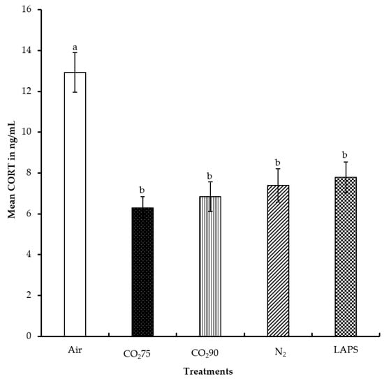 The serum CORT and 5-HT levels obtained after ELISA and the data of behavioral variables were summarized in a spreadsheet (MS-EXCEL, Microsoft, Redmond, WA, USA). Data were statistically analyzed using a one-way analysis of variance following PROC ANOVA procedures (SAS 9.4, Cary, NC, USA). Least-squares means were compared using Fisher’s Least significant difference (LSD) post hoc test in the event of significant global effects [26]. The statistical tests were carried out at 5% significance level. Two CORT samples from the 90% CO2 treatment and one from 100% N2 treatment were identified as outliers by Tukey’s boxplot method and removed from study.
