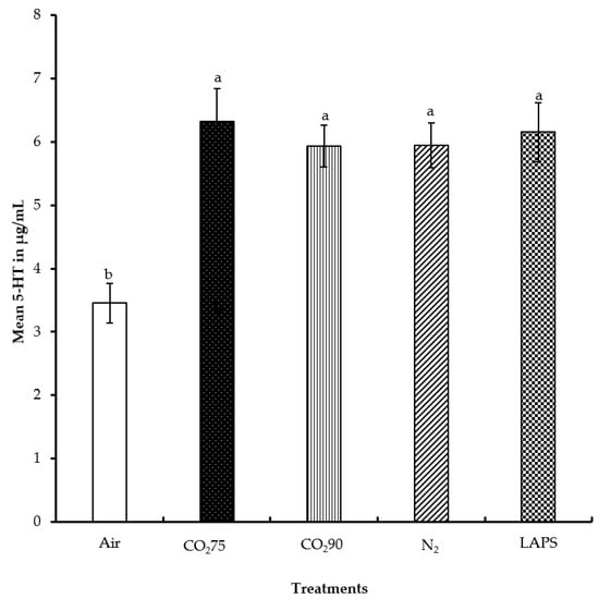 The 5-HT concentration in the peripheral blood of male layer chicks subjected to the five treatments were evaluated and compared. The mean serum 5-HT levels of chicks in the negative control, 75% CO2, 90% CO2, 100% N2, and LAPS treatments were 3.5, 6.3, 5.9, 5.9, and 6.2 µg/mL, respectively (Figure 5). Chicks in the negative control group had a significantly lower concentration of serum 5-HT than those in the rest of the treatments (p ≤ 0.0001). No significant differences were found in the 5-HT levels among the 75% CO2, 90% CO2, 100% N2, and LAPS treatment groups.