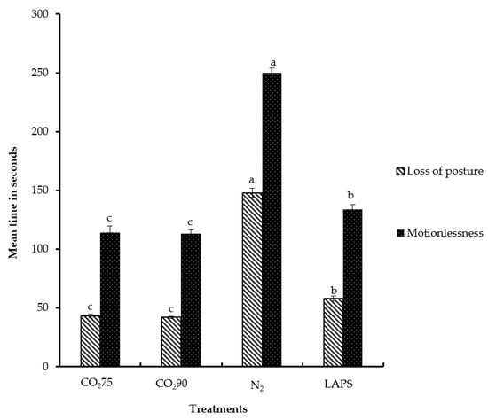 Mean latencies to loss of posture and motionlessness of male layer chicks. The latencies are expressed in s. Bars (mean ± SEM) with different superscripts are significantly different by Fisher’s LSD test (p < 0.05). Number of samples per treatment was 10.