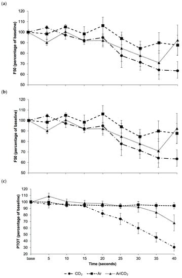 Changes in F50, F95 and PTOT over the first 40 s of exposure to treatment gases, relative to baseline, are shown in Figure 1. Data beyond 40 s exposure time are not presented, as EEG was transitional in 5/5 piglets in the CO2 group and 1/5 piglets in the Ar/CO2 group beyond this point.