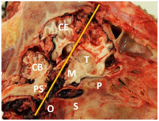 Figure 2). The depth of penetration for a PCB used in packing plants is approximately 8.9 cm (3.5 inches). In these studies, mean bolt penetration depth was measured at 14.1 cm (5.5 inches) in study 1 and 15 cm (5.9 inches) in study 2. There were frequent fractures of the sphenoid and occipital bones, which make up the floor of the cranial vault. Direct damage to the thalamus/hypothalamus and brainstem was present in nearly all animals (