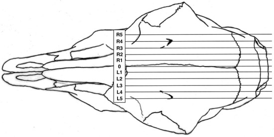 All experimental animals were frozen after killing and subsequently thawed for post mortem examination. The head was examined for external lesions, including laceration at the point of impact. For all carcasses, the skin from the head was removed following a cranial T incision to the shoulders and extending forward to the nose. The impact site was photographed with a digital camera (PENTAX Optio WG-1 or PENTAX K-50 (Ricoh Imaging Europe, Rungis, France)) before removal of any haematoma and the periosteum to expose fracture lines extending from the impact site. Photographs were taken of the fracture patterns to allow for later comparison. The heads were removed from the carcasses and placed in a sequentially numbered bag with the corresponding ear tag and subsequently individually hard frozen to facilitate sectioning on the sagittal plane for photography of cranial and brain lesions to be undertaken. Freezing prior to cutting with a bandsaw prevented distortion of macroscopic lesions. To determine the most effective application position the location of each shot was recorded retrospectively during post mortem based on the lateral and sagittal guide (Figure 3 and Figure 4) to produce a shot code for each head.