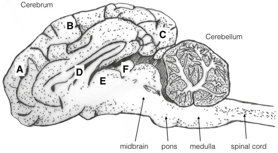 Sagittal diagram of a brain illustrating the areas examined for macroscopic damage. (A) frontal cerebrum, (B) parietal cerebrum, (C) occipital cerebrum, (D) lateral ventricle. These were scored on the basis of 0 = no damage, 1 = slight deformation, 2 = moderate deformation, and 3 = severe deformation of the area. The frontal (A), parietal (B), and occipital cerebrum (C), lateral ventricle (D), thalamus (E), pineal gland (F), midbrain, pons, medulla, and cerebellum were assessed for presence or absence of haemorrhage with a score of 1 indicating presence of haemorrhage and 0 the absence of haemorrhages.