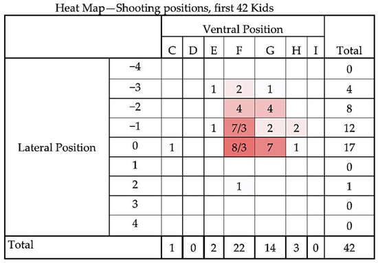 Figure 6 and Figure 7 compare the distribution of application positions for the first 42 kids versus the remaining 158 animals as a heat map, clearly showing the revised and effective shot position. A heat map is a graphical representation of data where the individual values contained in a matrix are represented as colours [16].