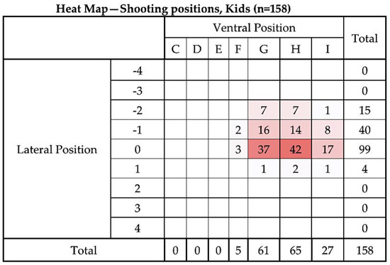 Heat map of the distribution of application positions (right-handed operative) for the remaining 158 kids. Colour intensity is related to number of applications in each location. Lateral target area, with 0 representing the midline based on the suture of the paired frontal bones with positive values to the LHS and negative values to the RHS of the head (see Figure 3). Ventral targeting areas using surface topography with F representing a shot on the frontal–parietal suture, G on the parietal bone, H on the parietal–occipital suture, etc. with C rostral to the head (see Figure 4).