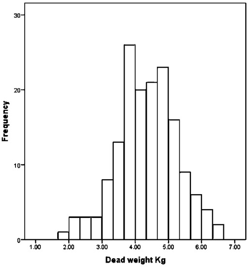 The distribution of kid dead weights (n = 158).