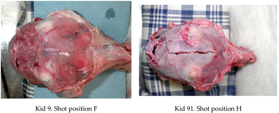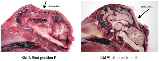 The caudal shot position (ventral position H, Figure 4) employed with these animals (kids) led to less macroscopic physical damage to the cerebrum when compared with the other species (piglets and lambs) tested [10,11,14].