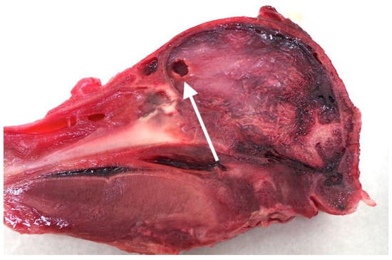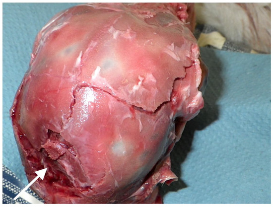 As reported in Grist et al. [10] with neonate piglets, an incidental finding during the post mortem examination of the neonate goat heads was that 10 animals (5%) displayed lesions consistent with abscesses or pronecephaly within the cerebrum, the latter resulting from lack of development and destruction of the cortex, normally due to viral infections in utero [23]. These cysts are usually surrounded by a membrane of astroglial cells that appear white (Figure 12). The fact that 5% of kids presented with pre-existing macroscopic brain lesions should, in the author’s view, be researched further but is outside the scope of this present study.