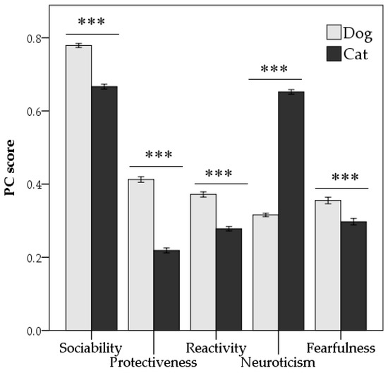 The five behavioural subscales, as resulted by scoring of PCs, were subsequently analysed by a paired t-test to check whether there were differences between dogs and cats living in the same household. Dogs scored higher in sociability (p < 0.001), protectiveness (p < 0.001), reactivity (p < 0.001), and fearfulness components compared with cats, that scored higher in neuroticism PCs (p < 0.001) compared with dogs (Figure 1).