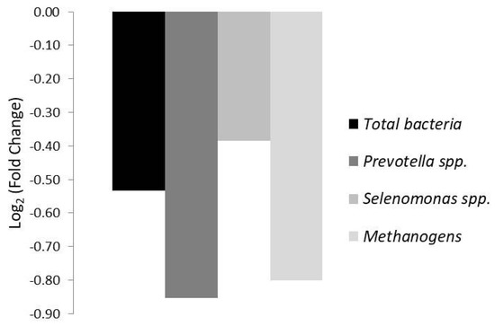 No significant differences were observed between treatments in color, height, or width of ruminal papillae, or thickness of stratum corneum (Table 2). The amount of total bacteria and the relative abundance (quantified by qPCR) of the microbial groups examined in the rumen (e.g., Prevotella spp., Selenomonas ruminantium, and methanogens) was not significantly affected by treatment (Figure 1).