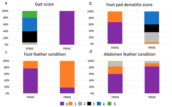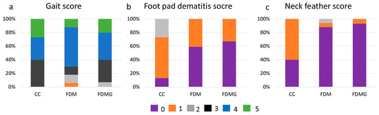 3.2.2. Gait Score, Foot Pad Dermatitis Score, and Feather Condition Score