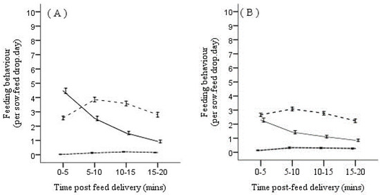 Figure 1. The average (±95% confidence interval) number of times sows were recorded performing feeding behavior (per sow, feed drop and day) in areas of the pen associated with high (▬), reduced (- - -) and no (···) feed availability recorded over four, 5-min time periods immediately following feed delivery in gestations 1 (A) and 2 (B).