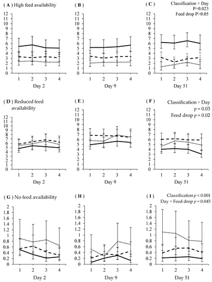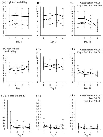 Figure 2. Gestation 1: The average (±95% confidence interval) number of times dominant (▬), subdominant (---) and submissive (···) sows were recorded showing feeding behavior (y-axis) in areas associated with high (AC), reduced (DF) or no (GI) food availability, when fed over four feed drops (x-axis) on days 2, 9 and 51 post-mixing.