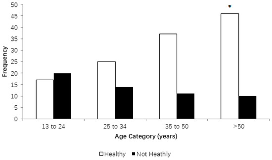 Relationship between the ages of respondents who thought that the brown-throated sloths in Tiradentes Square, Teofilo Otoni, Minas Gerais, Brazil were healthy. * p < 0.05.