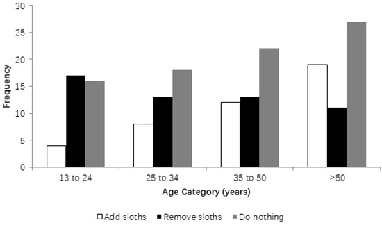 When asked what they think should be done with the sloths from Tiradentes Square, people thought it was best to leave things as they were because sloths were already adapted to the environment, despite the noise and air pollution, and believed that to take them to another place would be bad for the sloths’ wellbeing. Additionally, people believed that more animals should not be introduced to the square as it is not the ideal environment for them. Those who thought they should bring more animals into the square would like to restore the “original” and larger sloth population size because they believed that the population decrease was mainly due to traffic. These responses were, especially, given by older people who had, historically, witnessed a larger population living in the square. Compared to young and middle-aged people, the thoughts of old people are regularly referenced to the past and show less concern about the future [26].