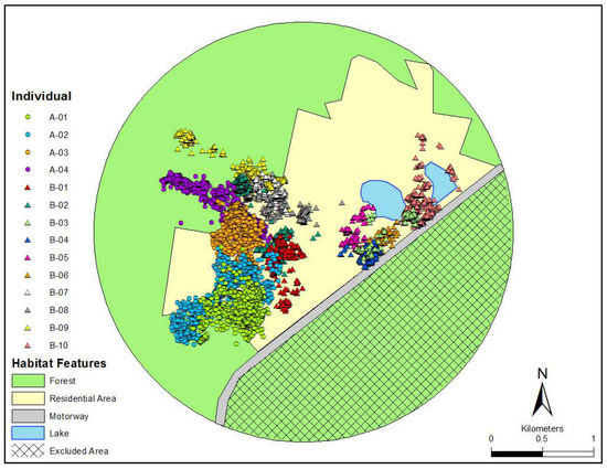 To determine habitat preference (forest versus residential area) we used the habitat composition of our defined ‘study area’ (