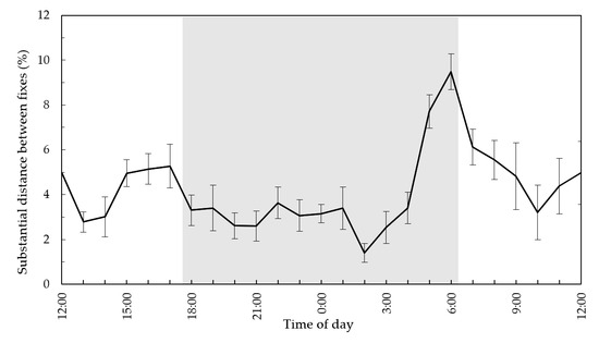 p < 0.001). The maximum of the sin-function at 19.08 degrees indicates that higher speed values represent more directional movement. Kangaroos showed an increase in movement activity around dawn with a peak at 6:00 am where almost 10% of substantial movements (>5 m/min) occurred (