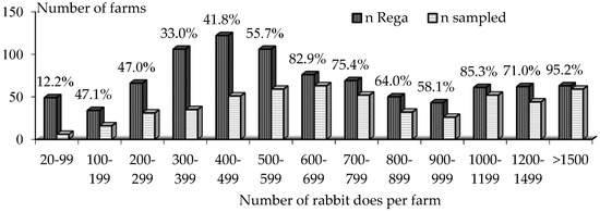 Size distribution of 906 rabbit farms registered in the official census of farms in Spain (n Rega), in summer 2017, and sizes of 490 study farms with examined does in Spain from 2001 to 2017 (n sampled). The percentages of sampled farms by strata are shown.