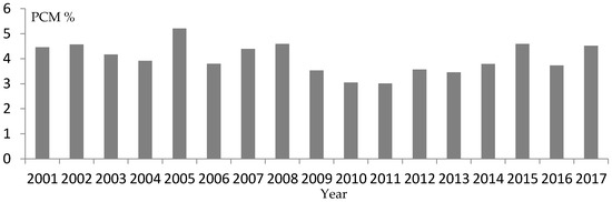 From 1986 (PCM = 9.1%) to 1996 (5.2%) the year had an enabling effect [8]; however, PCM was 4.40% during 1997–2000 [48], and 4.05% during 2001–2017.