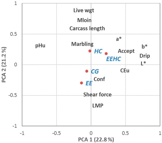 Principal component analysis: correlation of the variables with the principal components and average coordinate of the observation by treatment (CG: not supplied and no enriched environment; HC: supplied with herbal compound; EE: Enriched environment; EEHC: supplied with herbal compound and enriched; Conf: conformation, LMP: lean meat percentage; Accept: acceptability according to consumers’ evaluation). MLOIN: minimum fat over the Gluteus medius. pHuLT: muscle pH (acidity) at Longissimus thoracis 24 h post mortem (p.m.); ECuLT = electrical conductivity (ability to transport electrical charges) measured in the Longissimus thoracis; Marbling NPPC: subjective marbling (intramuscular fat) with pattern from National Pork Producers Council (means of three assessors); L*, a*, b*: objective measure of the colour with the Minolta Chromameter.