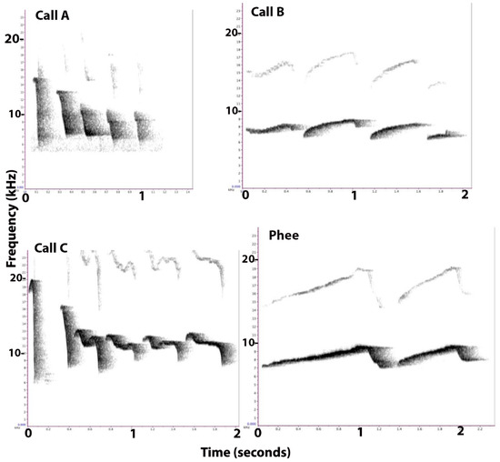 Figure 1. Representative sonograms of Calls A, B, and C, and, for comparison, of a phee call. Frequency in kilohertz (kHz) is plotted on the y-axes and the duration, in seconds, is plotted on the x-axes. Note that the scale differs slightly for each call type.