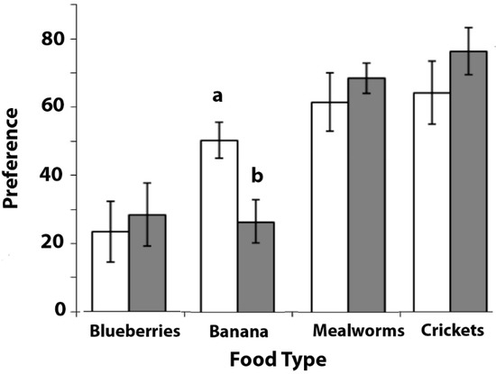 A comparison between the first and second data sets showed that banana was preferred more in the first testing period compared with those in the second testing period (Wilcoxon Signed Ranks, Z = −2.521, p = 0.012). No significant change occurred in the preferences for blueberries (Z = −0.674, p = 0.500), mealworms (Z = −0.338, p = 0.735), or crickets (Z = −0.350, p = 0.726).