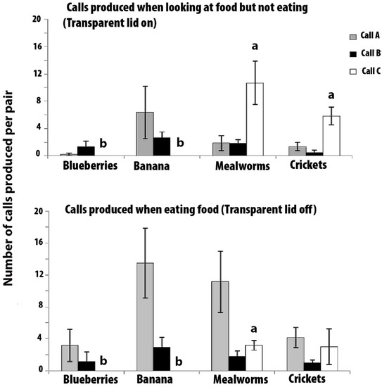 The mean numbers of calls that were produced (±SEMs) per pair in 3 min with the lid on and 3 min with the lid off are presented in Figure 3. No calls of type A, B, or C were produced during the 6 min pre-test period, although some phee calls were heard during this period. Some trills were heard when the experimenter entered the room with the food bowl, but Calls A, B, and C were produced only when the food was presented. Note that Calls A and B were made in the presence of all of the food types, but call C was produced only when the mealworms and crickets were presented.