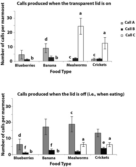 Call A: Non-parametric tests were used, as the data could not be normalised by transformation. There were significant differences between the number of A calls that were given for different foods during the lid-on condition (Friedman Test: χ2 = 10.481, p = 0.015) and also the lid-off condition (χ2 = 7.907, p = 0.048). The post hoc Wilcoxon Signed Ranks test revealed that, during the lid-on condition, there were significantly more A calls that were produced when the marmosets could see banana than when they could see mealworms (Z = −2.521, p = 0.012) or crickets (Z = −2.310, p = 0.021). However, no significant difference was found between the banana and blueberries (Z = −1.245, p = 0.213), blueberries and mealworms (Z = −1.761, p = 0.078), blueberries and crickets (Z = −0.211, p = 0.833), and mealworms and crickets (Z = −1.841, p = 0.066).