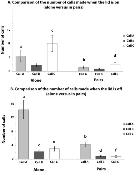 Figure 5. Comparison of the number of calls made in each 3 min period when tested alone compared to in pairs. (A) Lid-on condition. (B) Lid-off condition. Means are plotted and standard errors are indicated. Bars with (a) differ significantly from those with (b), (c) from (d), and (e) from (f). Although no C calls were elicited by banana or blueberries, the mean scores that are plotted included all of the presentations (insects and fruit). However, an analysis of the data did not include the zero scores for the banana and blueberries: see text.