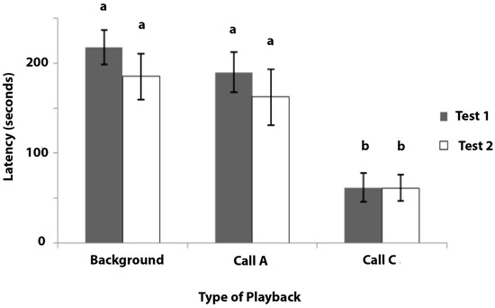 Figure 6. Experiment 4. Mean latency in seconds from the commencement of the playback to the first inspection of the cup (for mealworms) is plotted with standard errors indicated. The playbacks were background noise that was recorded in the animal house, Call A, and Call C. Bars marked (a) are significantly different from those marked (b). N = 7. Maximum response latency was 240 s.