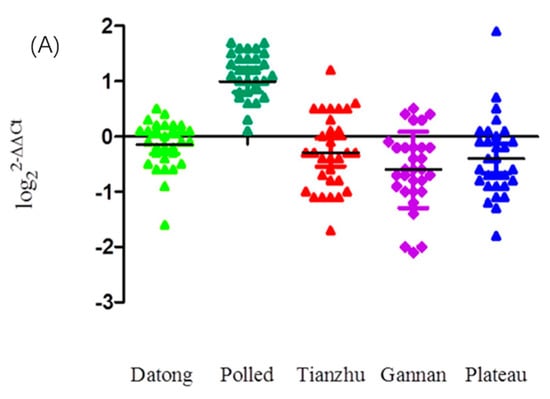 The diversity between yak breeds was determined in relation to the control sample using the log2 ratio (log22−ΔΔCt) values and the types of CNVs were defined as gain (>0.5), loss (<−0.5) or normal (<|±0.5|) [,,,,]. Pairwise comparisons and scatterplot analyses of the yak breeds were performed using GraphPad Prism software (version 5.00) and the values were obtained from the log2 ratio (log22−ΔΔCt). The pairwise comparisons between breeds were tested using Tukey’s multiple comparison tests.
