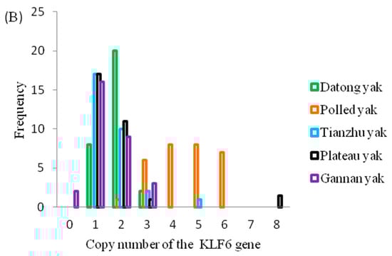 The following are available online at http://www.mdpi.com/2076-2615/8/9/145/s1, Table S1: Distribution of the KLF6 gene CNV types among yak breeds, Table S2: Pairwise comparison of CNV of the KLF6 gene in five Chinese domestic yak breeds, Online available: http://datadryad.org/review?doi=doi:10.5061/dryad.7ch25j3.