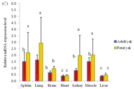 Expression profiles of the KLF6 gene in Datong yak at two ages. (A) Expression pattern of the KLF6 gene in fetal yak. (B) Expression pattern of the KLF6 gene in adult yak. (C) Comparison of KLF6 gene expression between the two ages. The error bars indicate the standard deviations (SDs). Different letters indicate significant differences (p < 0.05).