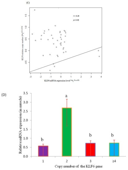 Among 41 samples, the tested skeletal muscle was found to contain 14, 24 and 3 cases of the normal, gain and loss CNV types of the KLF6 gene. As shown in Figure 3A, among the individual tested yak muscles, the CNV types varied from 1 to 7 copies, whereas the expression of the gene varied from 0.2- to 1.6-fold (Figure 3B). A Pearson correlation analysis showed that the DNA copy numbers and mRNA levels of KLF6 were non-significantly (p = 0.08) and negatively (r = −0.28) correlated in adult skeletal muscle (Figure 3C). The comparison of CNV types and gene expression revealed that a normal copy number was more significantly (p < 0.05) associated with a higher mRNA expression level than the gain or loss types, whereas no difference was observed between the loss and gain CNV types (Figure 3D). These results underscored that the loss copy numbers of the KLF6 gene were predominant for growth traits and were correspondent with the negative association with between DNA copy number and the transcriptional level of the KLF6 gene (Figure 3C,D). These findings illustrated that the presence of at least two copies of the KLF6 gene was associated with higher expression of this gene.